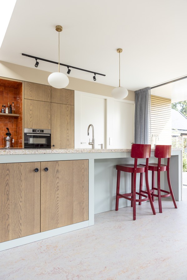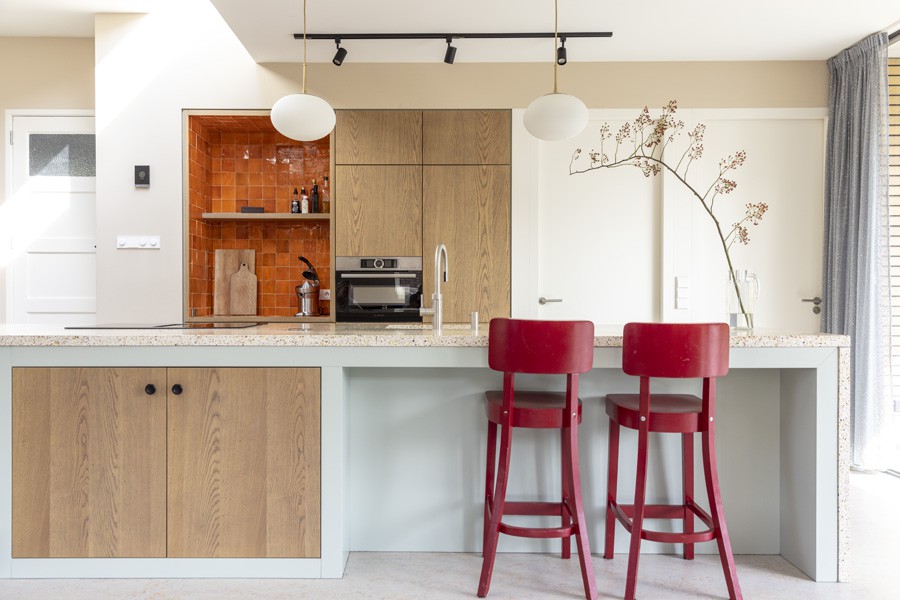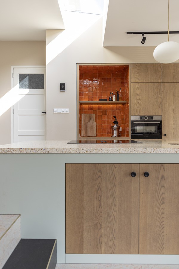 Het ontwerp van Kraal Architecten bracht licht, ruimte en verbinding met de tuin samen in één geheel. Centraal in het plan stond een royale leefkeuken met zicht op het groen. Een plek waar het gezin samenkomt. Daarnaast werd op de begane grond een slaapkamer met badkamer en een werkkamer gerealiseerd, zodat de woning toekomstbestendig is ingericht. Op de verdieping zorgen twee nieuwe dakkapellen voor extra licht en ruimte op de kinderkamers.